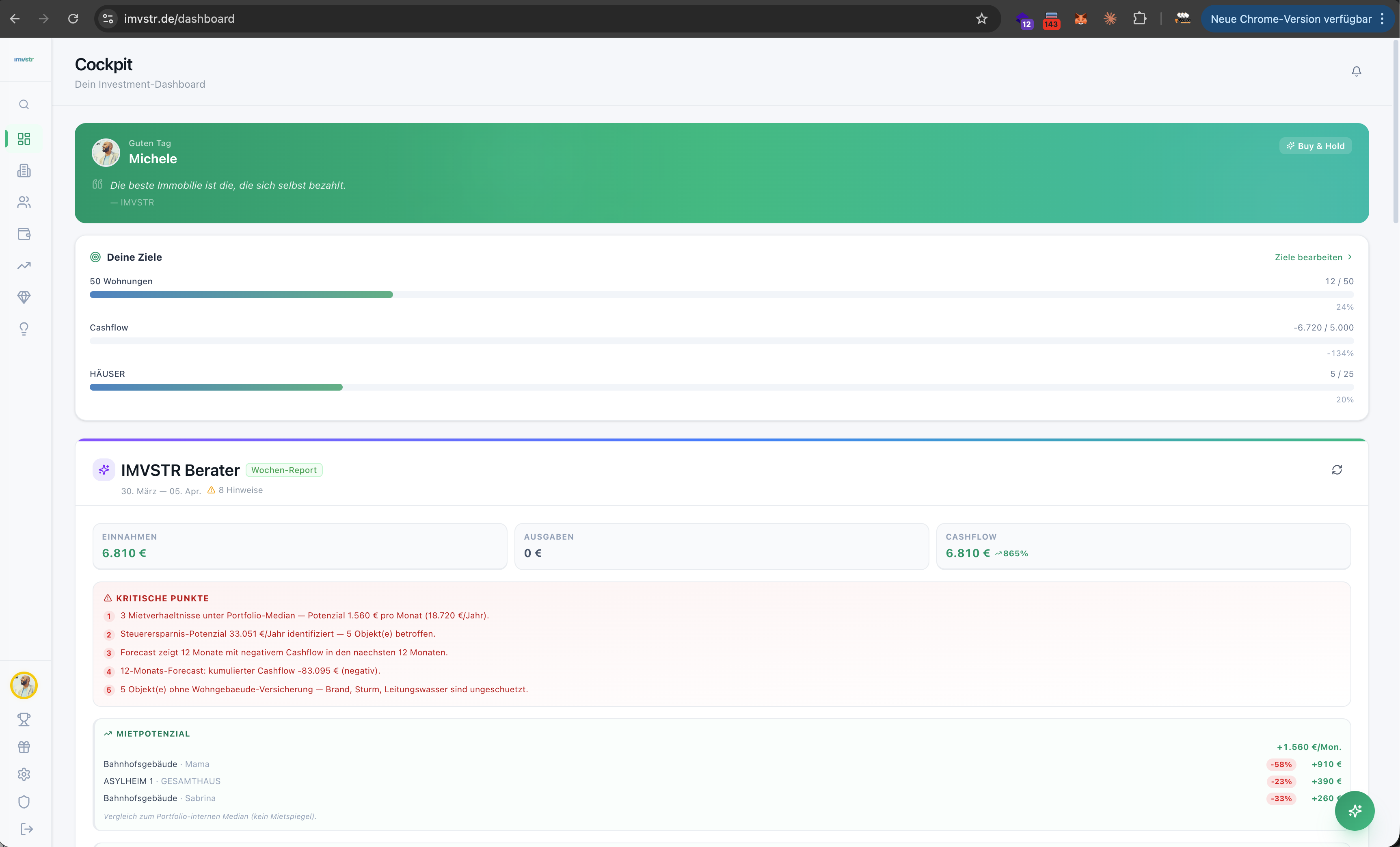 Dashboard zeigt Cashflow, Rendite und Mietpotenzial ab dem ersten Objekt