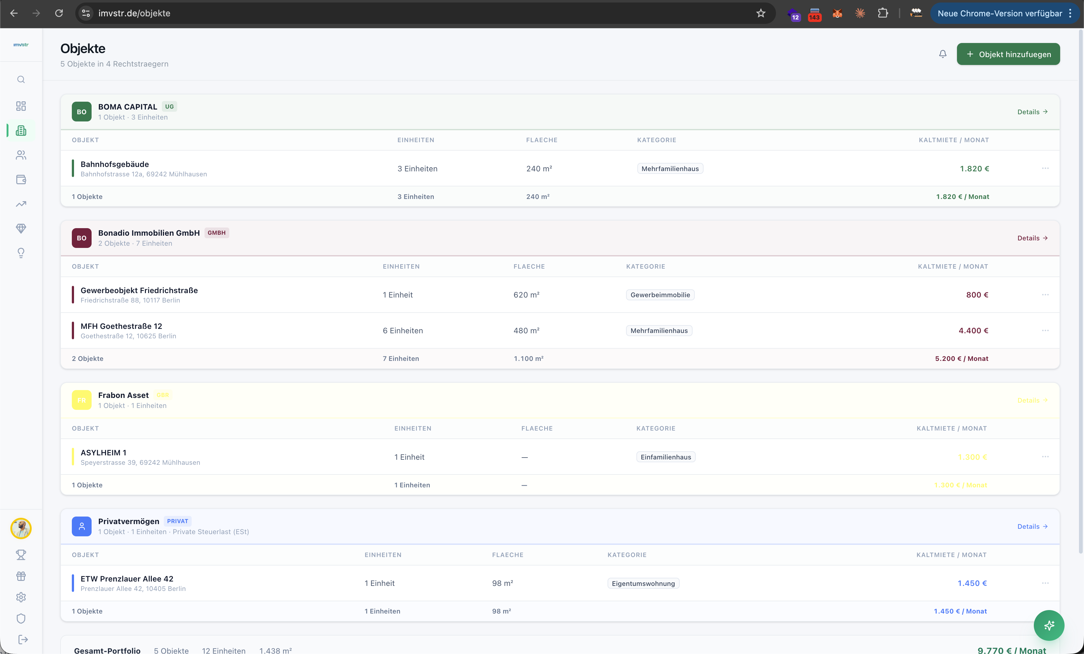 Objekte nach Gesellschaft gruppiert mit Einheitenzahl, Flaeche und monatlicher Miete